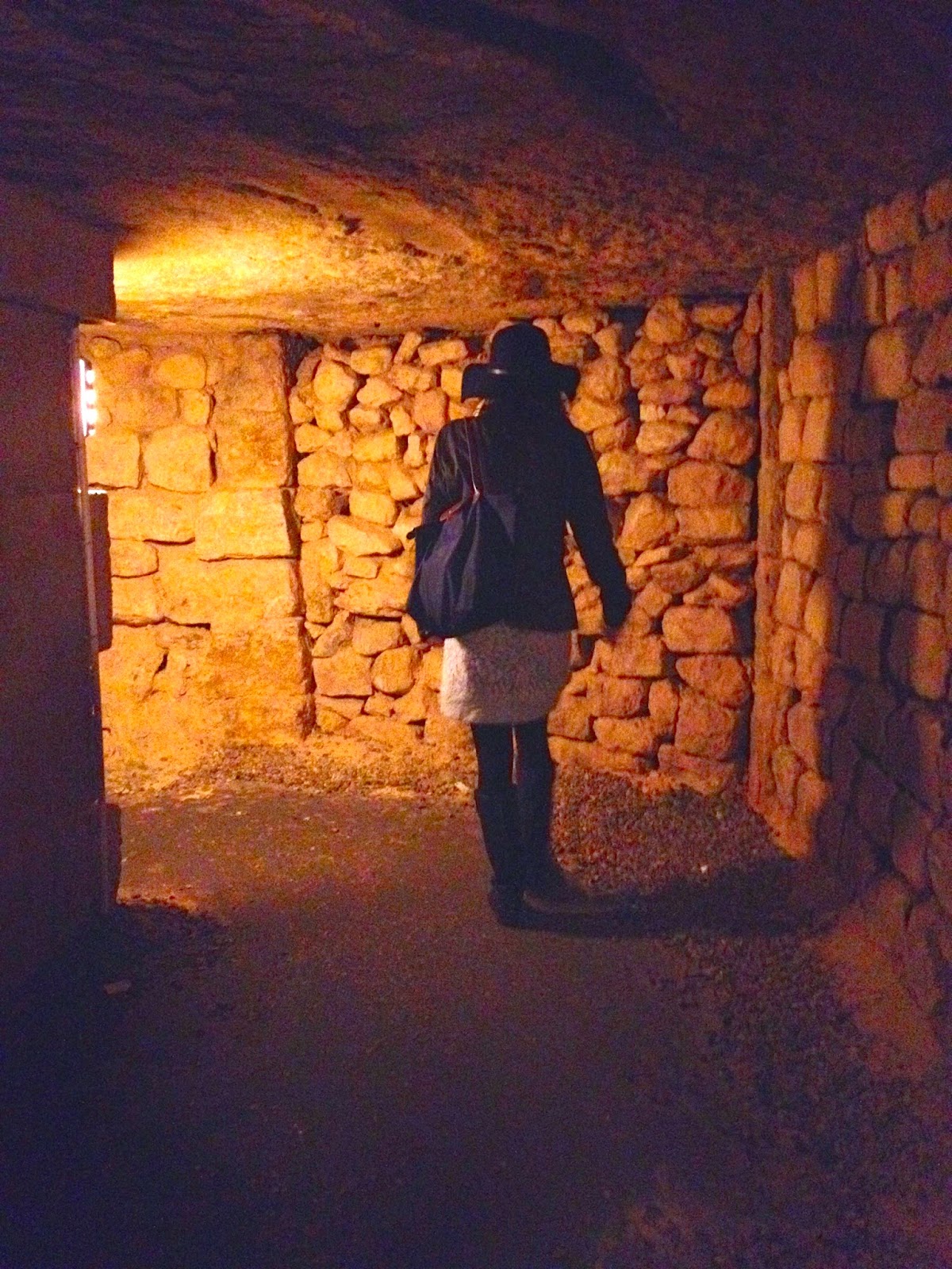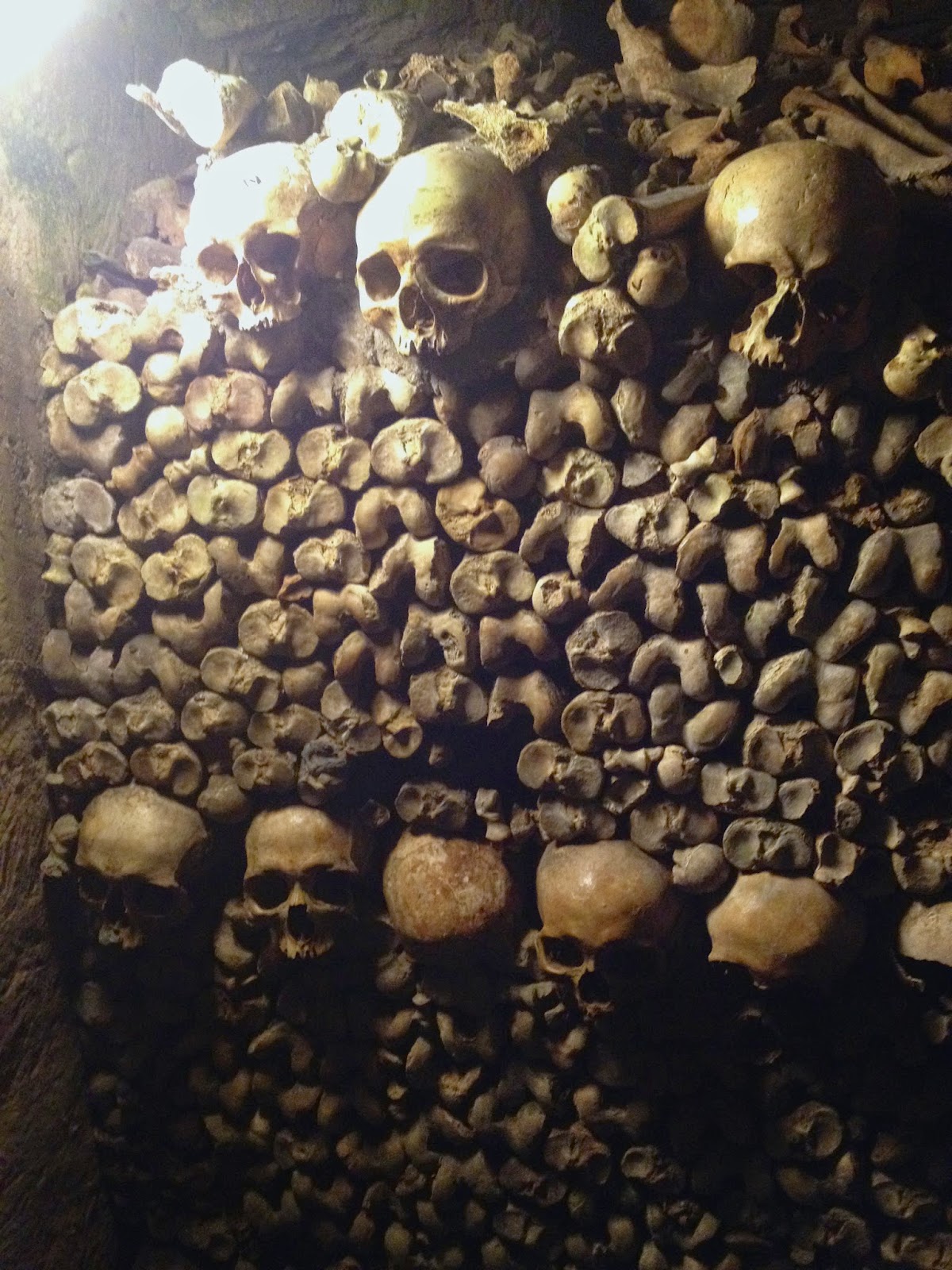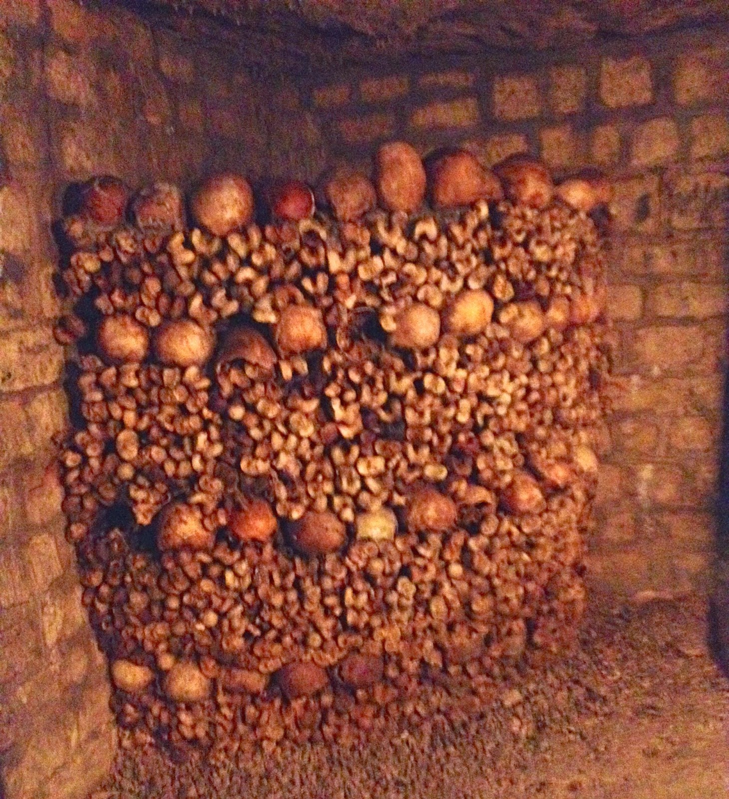 The Catacombs were created in former limestone quarries, which were mined for centuries beforehand. They are twenty meters (about 5 stories) below ground, and they contain the remains of around six million Parisians in 11,000 m² of underground space (we only walked a fraction of the tunnels I think). Bodies were transferred here gradually, between the late eighteenth and mid-nineteenth centuries because graveyards were being closed due to public health concerns. During the Revolution, people were buried directly in the Catacombs. When bodies were first transferred, bones were just thrown in piles and left there; in around 1810, the Catacombs were arranged in an orderly fashion with the skulls and long bones. Behind this, the remaining bones are still piled in a heap.