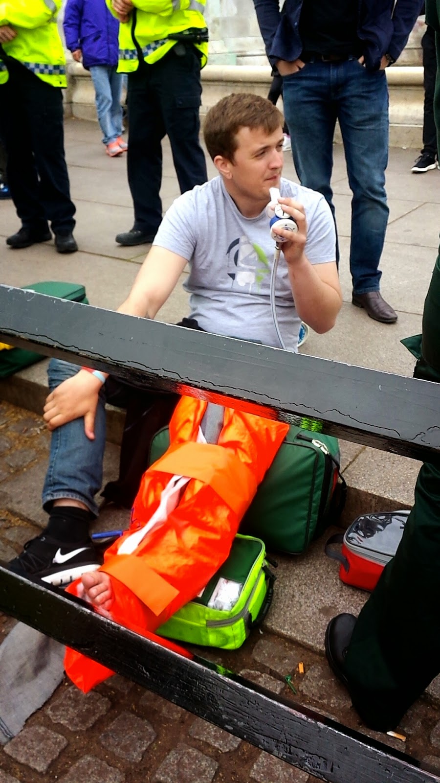 He landed funny, with one foot on the ground and one on the step leading up to the memorial. Then he broke an ankle. It was awful. Victoria and I saw the whole thing, and rushed over there to make sure he was okay. He was leaning on his friend, who was slightly laughing at him. Victoria asked if he was okay, and then she called the ambulance. Then while we were waiting, we got to talking. Luke (with the broken ankle) and Martin were training to be police and had come to London for the day. I asked him why he had thought jumping the fence was a good idea, and he replied (in a thick Scottish accent), "Honestly, I thought I was the fu*cking Batman."